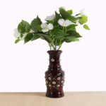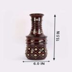 This exquisite decorative wooden flower pot showcases traditional Indian craftsmanship at its finest. The dark brown polished wood base is beautifully adorned with an intricate brass inlay featuring a diamond lattice pattern complemented by delicate floral motifs. Each piece is meticulously handcrafted, making it a unique addition to your home décor. Standing at 38.4 centimetres in height with a width of 8.89 centimetres, this elegant vase-shaped planter is perfectly sized for tabletop display. The traditional style and floral theme make it an ideal accent piece for living rooms, dining areas, or office spaces. Designed for indoor use, this flower pot adds a touch of sophistication and cultural richness to any interior setting. The polished finish and brass detailing create a stunning contrast that catches the eye and elevates your décor. Whether you’re displaying fresh flowers or using it as a standalone decorative piece, this wooden flower pot brings timeless elegance to your space. The 0.5-litre capacity is suitable for small to medium floral arrangements, making it both functional and decorative.