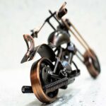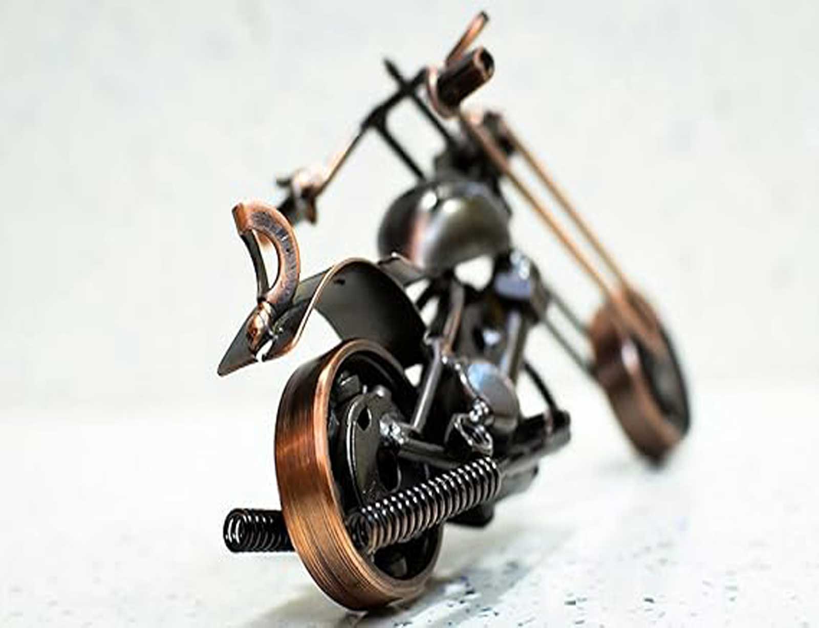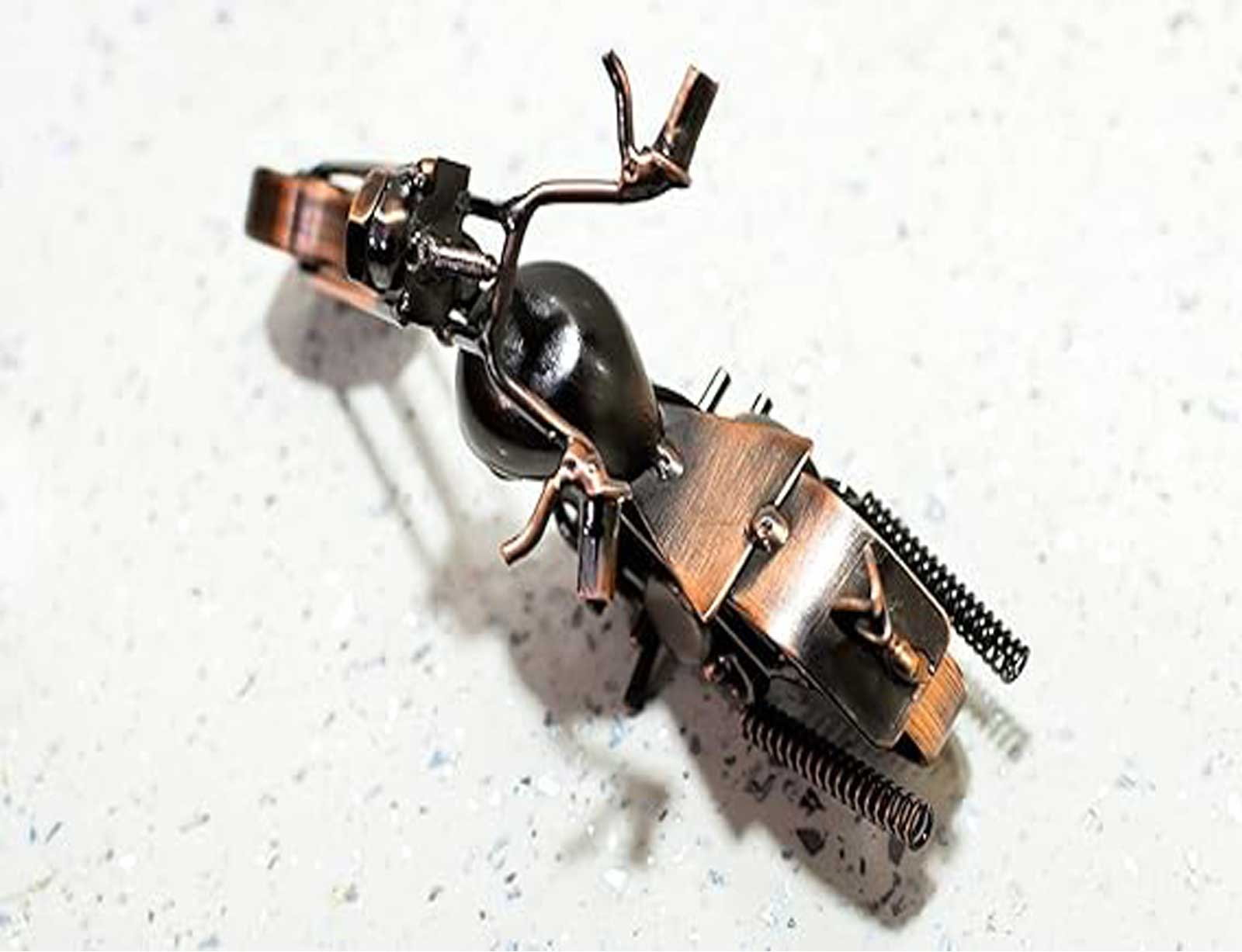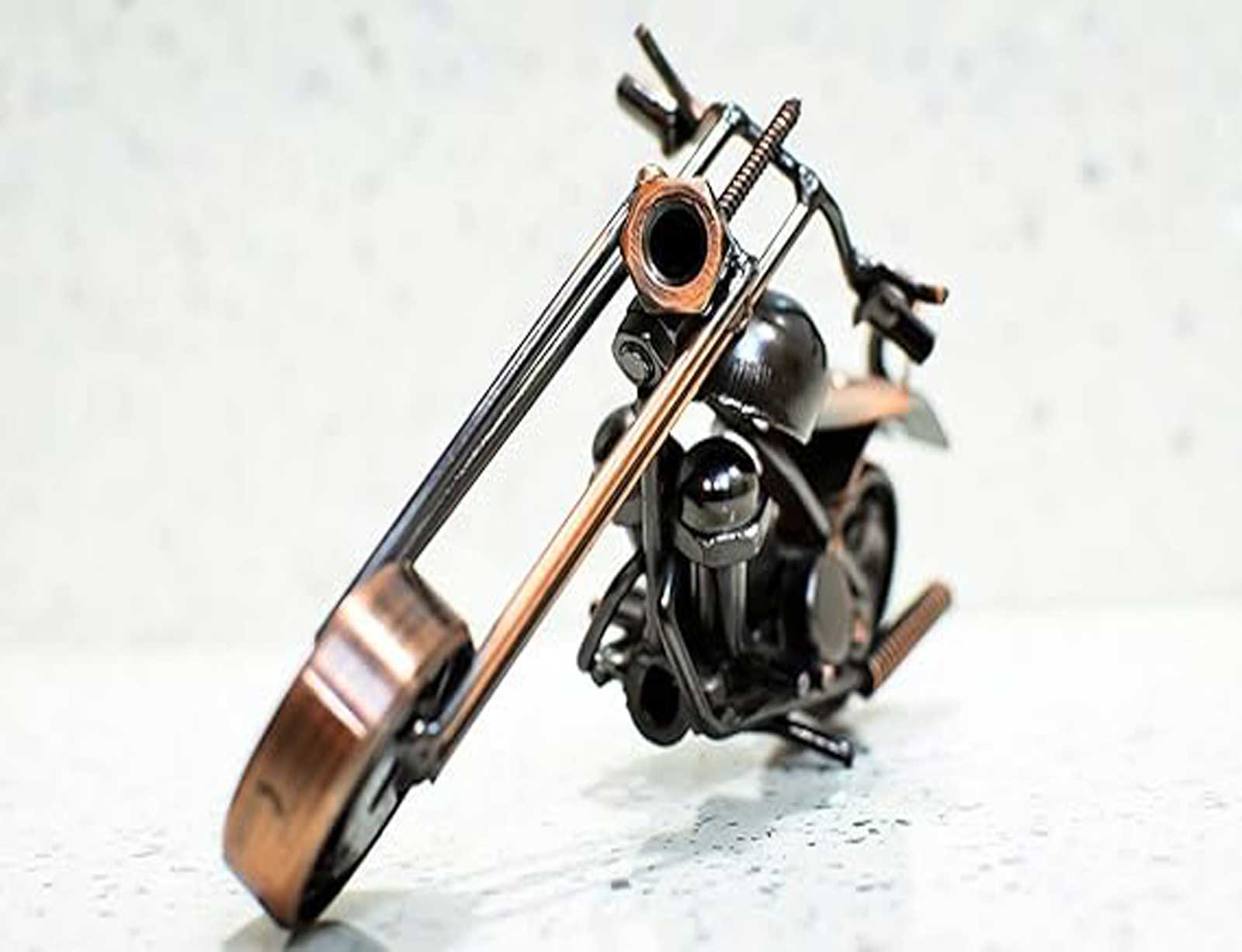 This exquisite metal motorcycle model is a stunning decorative piece that captures the spirit of classic motorcycles with remarkable attention to detail. Crafted from high-quality metal in an eye-catching black and bronze finish, this handcrafted sculpture showcases intricate craftsmanship that motorcycle enthusiasts and art collectors will appreciate. The medium-sized model measures approximately 18.0 centimetres in length and 12.0 centimetres in height, making it a perfect accent piece for desks, shelves, mantels, or display cabinets. Weighing 250 grams, this decorative motorcycle has a substantial feel that speaks to its quality construction. The piece features authentic details including handlebars, wheels with spring suspension elements, and a carefully sculpted body that brings the miniature bike to life. No assembly is required, so you can display this conversation-starting piece immediately upon arrival. Whether you’re decorating your home office, living room, or gifting it to a motorcycle lover, this metal bullet motorcycle model adds character and style to any space. Each piece is carefully packaged to ensure safe delivery. This unique decorative item from India combines artistic expression with a passion for motorcycles, making it an ideal gift or personal collectible.