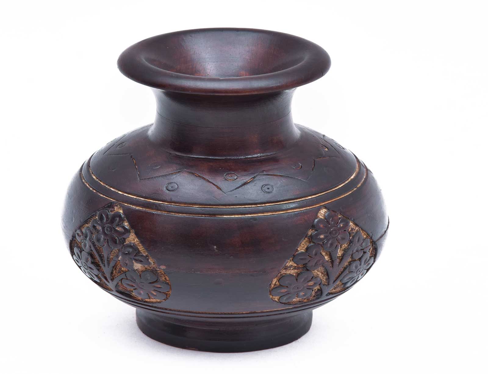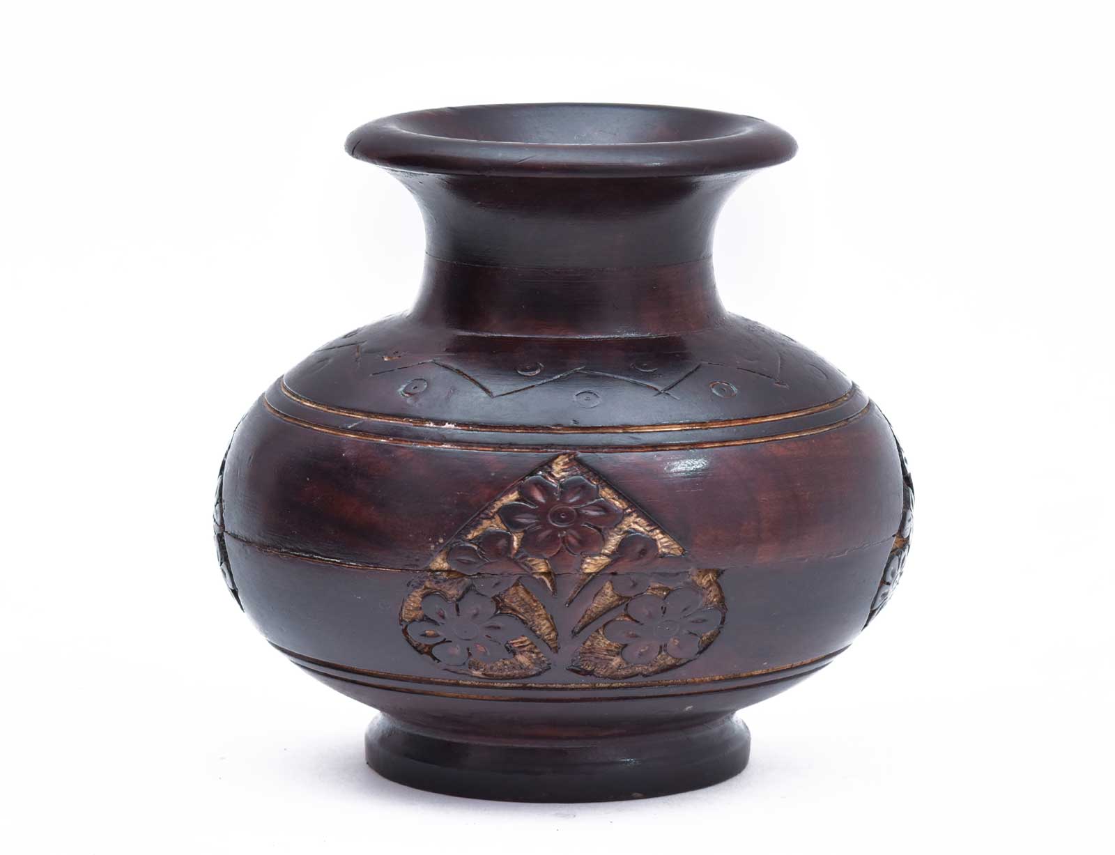 This exquisite handcrafted wooden flower pot brings traditional Indian artistry into your home décor. Featuring a rich dark brown finish with intricate brass inlay work, this decorative vase showcases a stunning diamond lattice pattern adorned with delicate floral motifs that reflect timeless craftsmanship. The polished wood surface is beautifully complemented by brass detailing that adds an elegant touch to the piece. Measuring 25.4 centimetres in height and 8.89 centimetres in width, this tabletop flower pot is perfectly sized for displaying fresh or artificial flowers in your living room, bedroom, or office space. The vase-shaped design with its wide body and flared opening creates a classic silhouette that suits both contemporary and traditional interiors. Weighing just 400 grammes, this indoor planter is lightweight yet sturdy, making it easy to reposition as you refresh your décor. The 0.5-litre capacity is ideal for small to medium floral arrangements. Each piece is specially handcrafted, ensuring that you receive a unique decorative item that celebrates traditional Indian design. This single-piece flower pot makes an excellent addition to your home décor collection or a thoughtful gift for those who appreciate fine craftsmanship and cultural heritage.