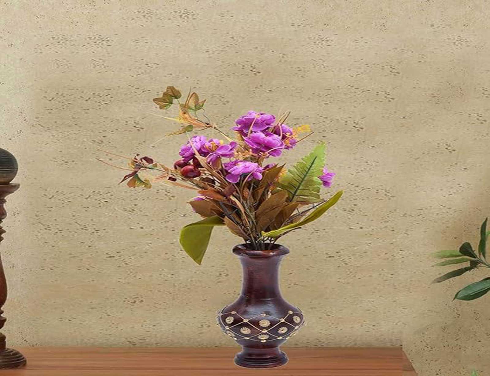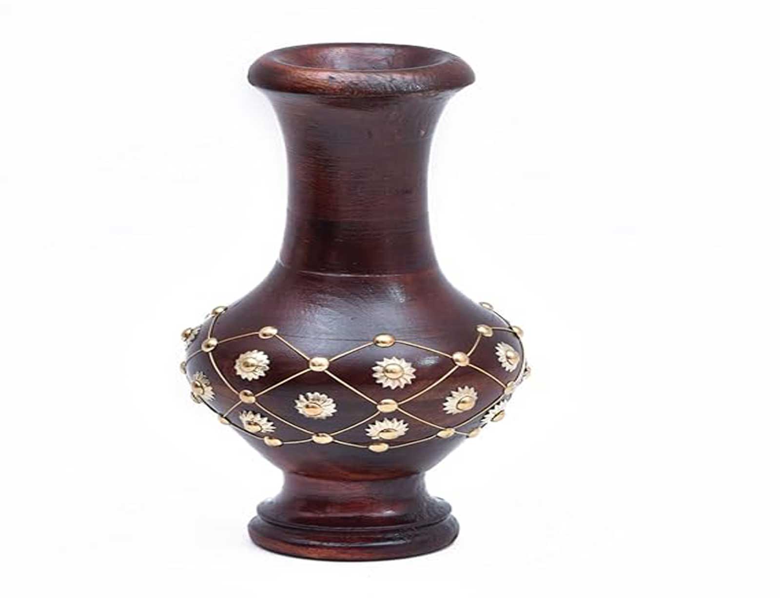 This exquisite wooden flower pot from SNOWGREEN EXPORT showcases traditional Indian craftsmanship at its finest. The dark brown polished wood base is beautifully adorned with intricate brass inlay work featuring a diamond lattice pattern with delicate floral motifs, creating a stunning visual appeal that complements any interior décor. Measuring 25.4 centimetres in height and 8.89 centimetres in width, this handcrafted vase-shaped planter is perfectly sized for tabletop display. The decorative piece weighs 400 grammes and offers a 0.5-litre capacity, making it ideal for displaying artificial or fresh flower arrangements. Each piece is meticulously handcrafted, ensuring that no two pots are exactly alike. The polished wood finish combined with the gleaming brass inlay creates a sophisticated contrast that draws the eye. Designed for indoor use, this traditional-style flower pot adds an elegant touch to living rooms, dining areas, or office spaces. The tabletop mounting type allows for versatile placement on shelves, mantels, or side tables. This single-piece decorative flower pot arrives ready to enhance your home with its timeless beauty and artistic charm.