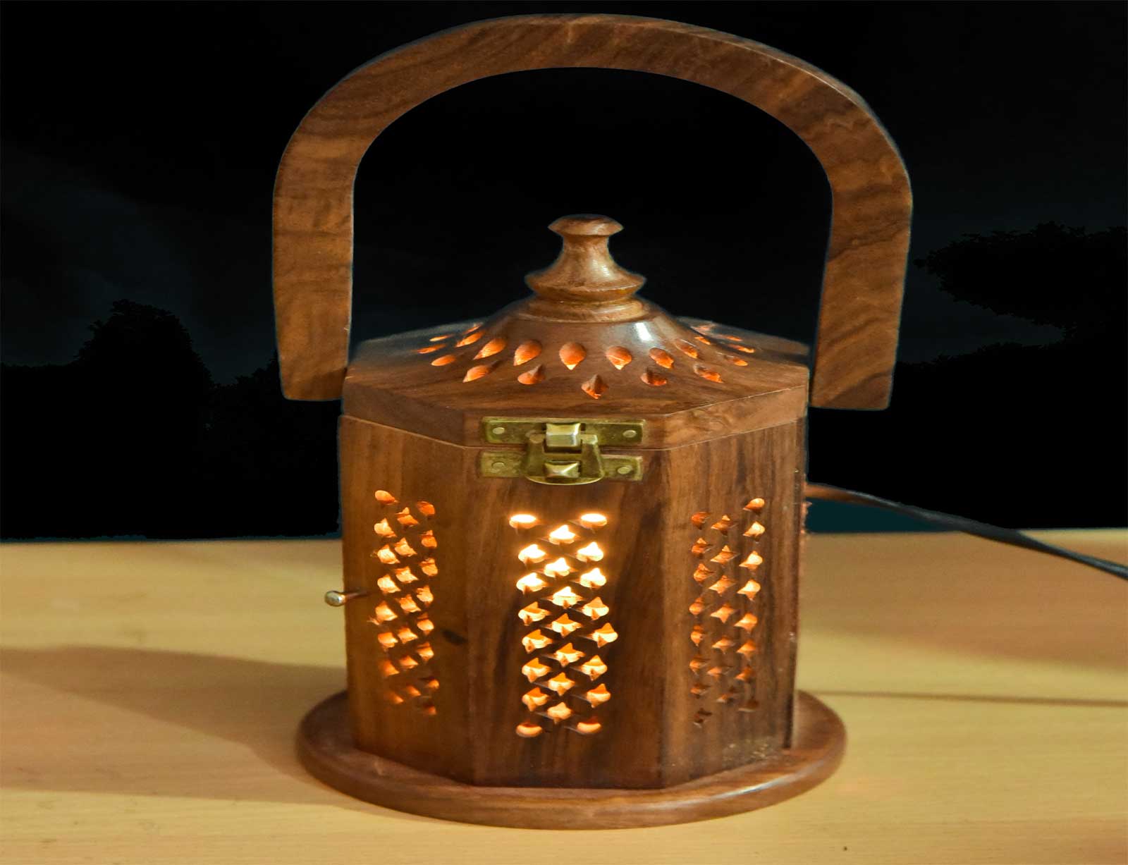 HANDCRAFTED DESIGN: Beautiful wooden lamp featuring intricate lattice cutwork patterns on all sides with a decorative arched handle and domed top with brass latch closure